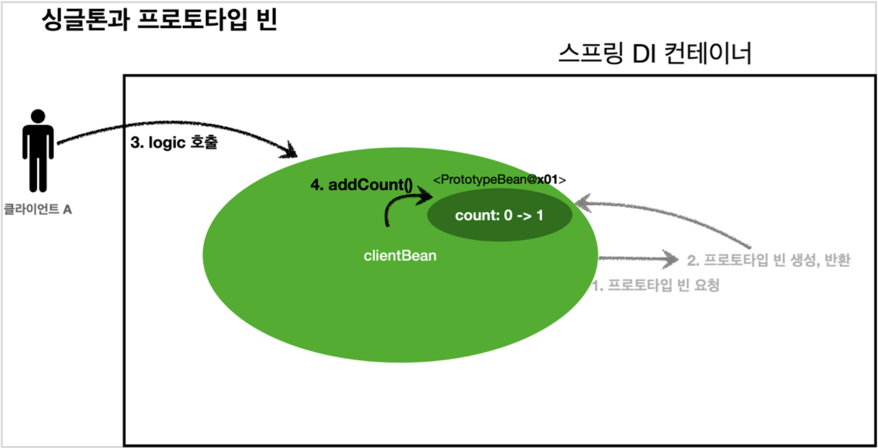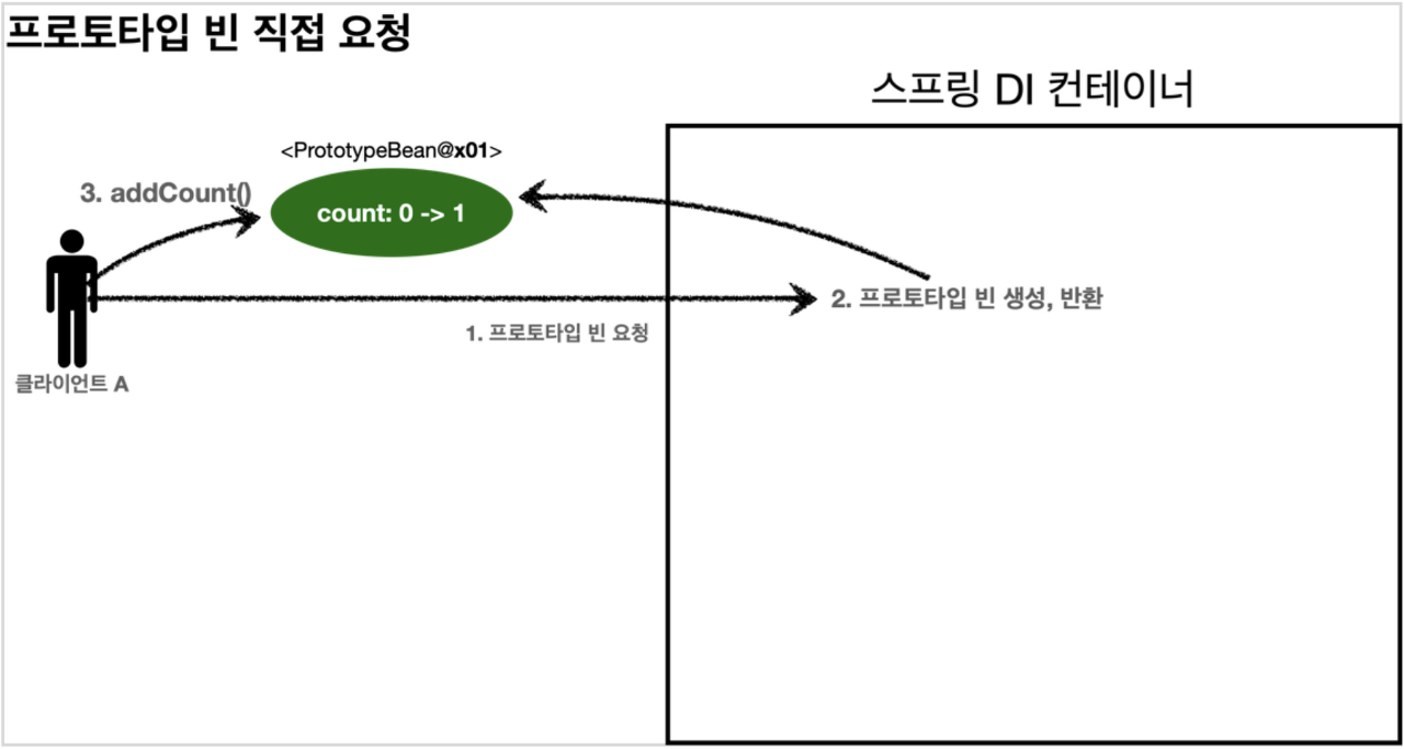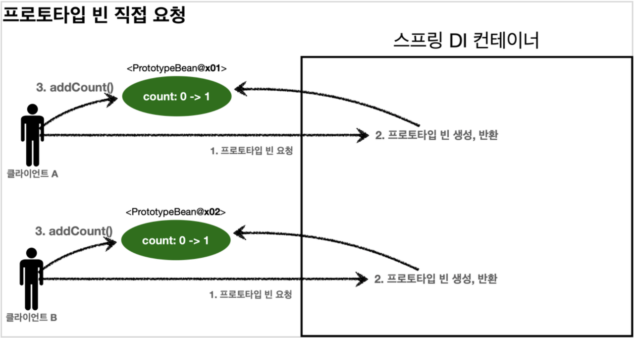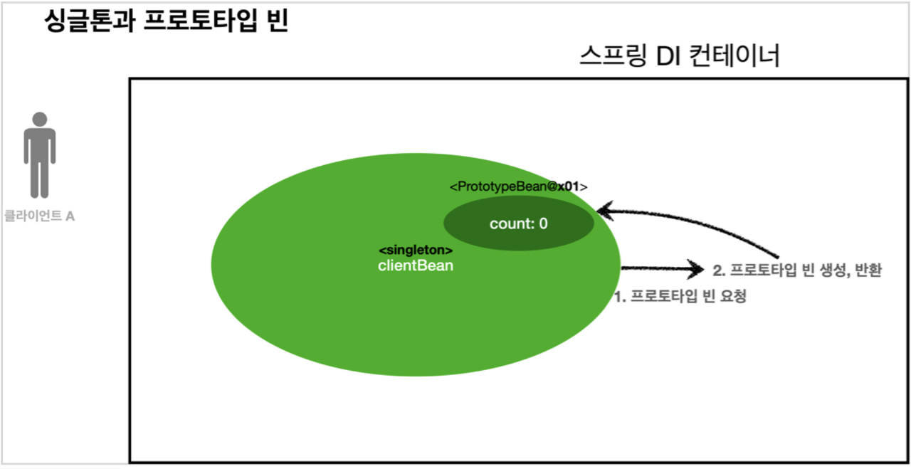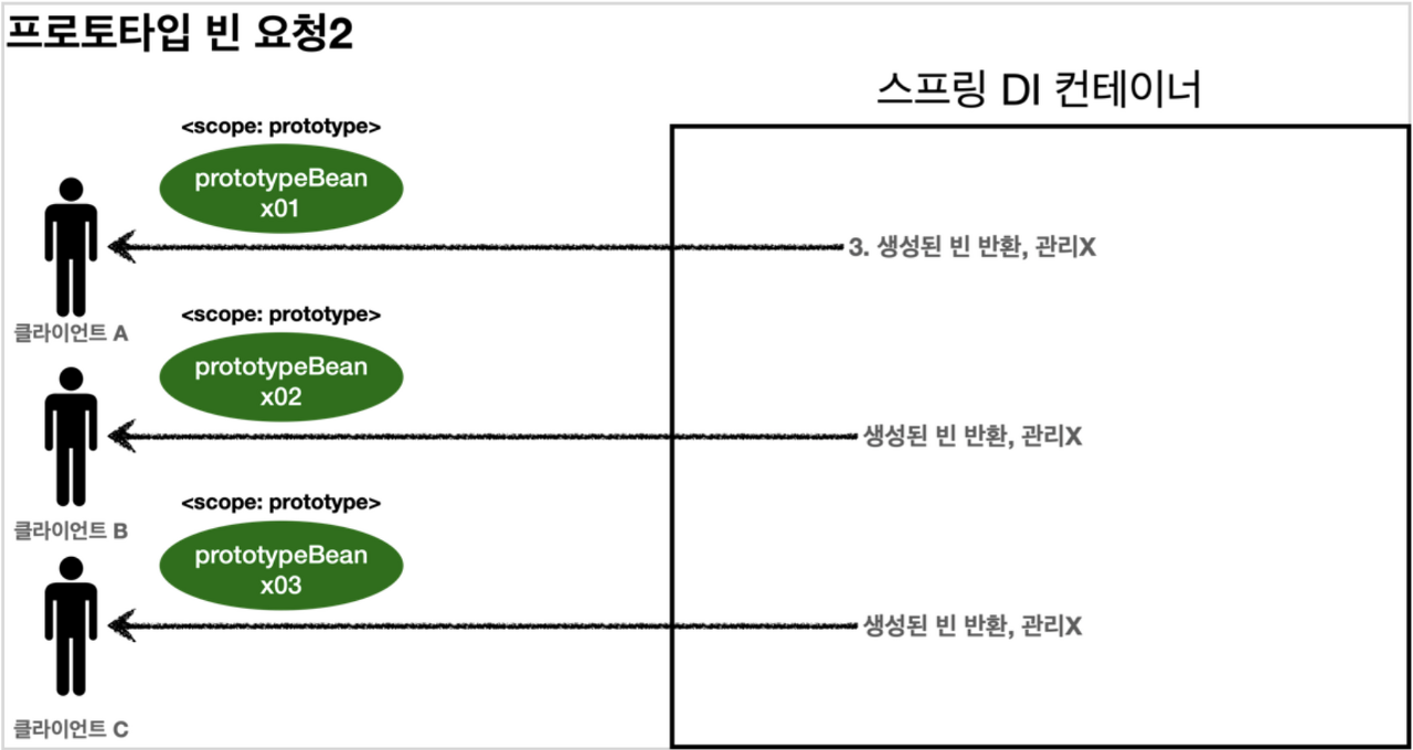 - 프로토타입 : 스프링 컨테이너는 프로토타입 빈의 생성과 의존관계 주입까지만 관여하고 더는 관리하지 않는
