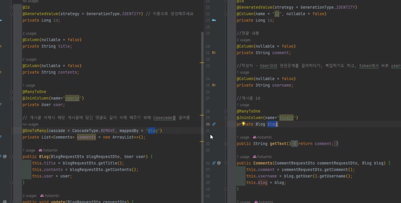 - 단방향이 아닌 양방향 매핑을 해주고, 관계의 주인이 댓글이고 외래키가 댓글의 'blog'이다.
