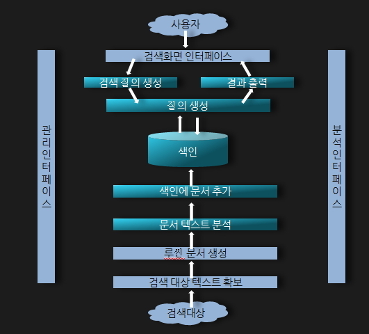 - 오픈소스 검색 엔진 : 아파치 재단의 루씬(Lucene)을 기반으로 개발된 오픈 소스 검색 엔진