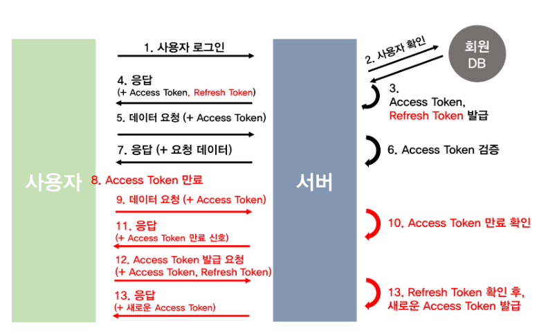 - 즉, 만료된 Accesstoken을 보내면 RefreshToken을 DB에 있는 것과 비교하여 AccessToken을 재발급해주는 원리