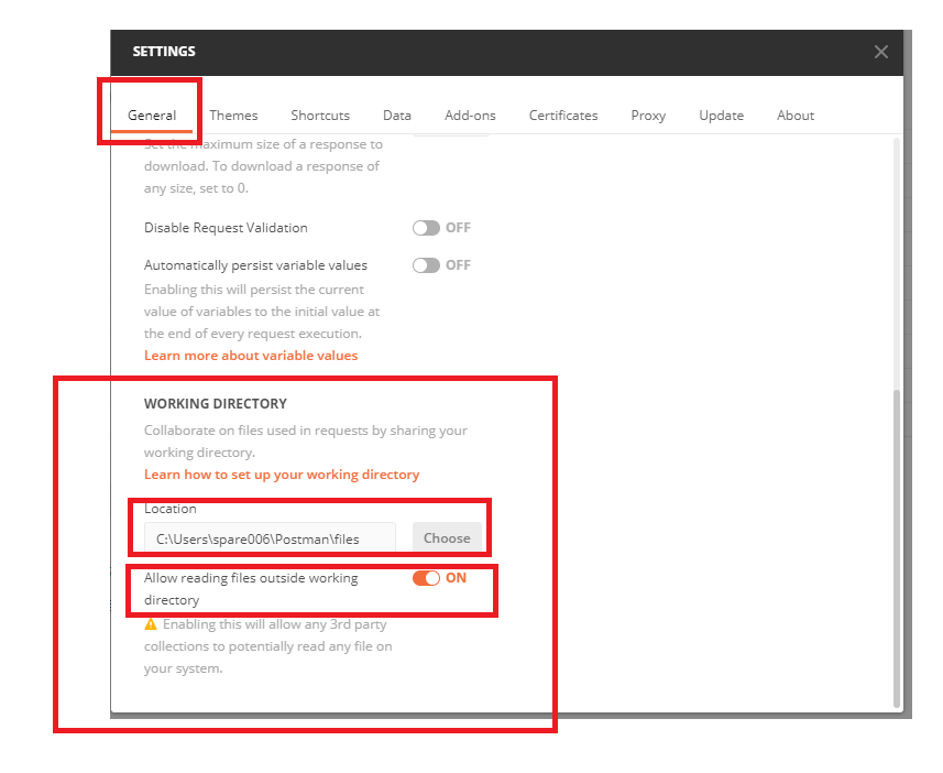 POSTMAN 에서 POST Method로 body의 form-data 전송시 파일도 보낼 수 있는건 알고있는데 working directory 에러로 파일 전송이 되지 않아 공식홈에 가보면 설정에서 디렉토리 설정하라는데 도무지 어디서 설