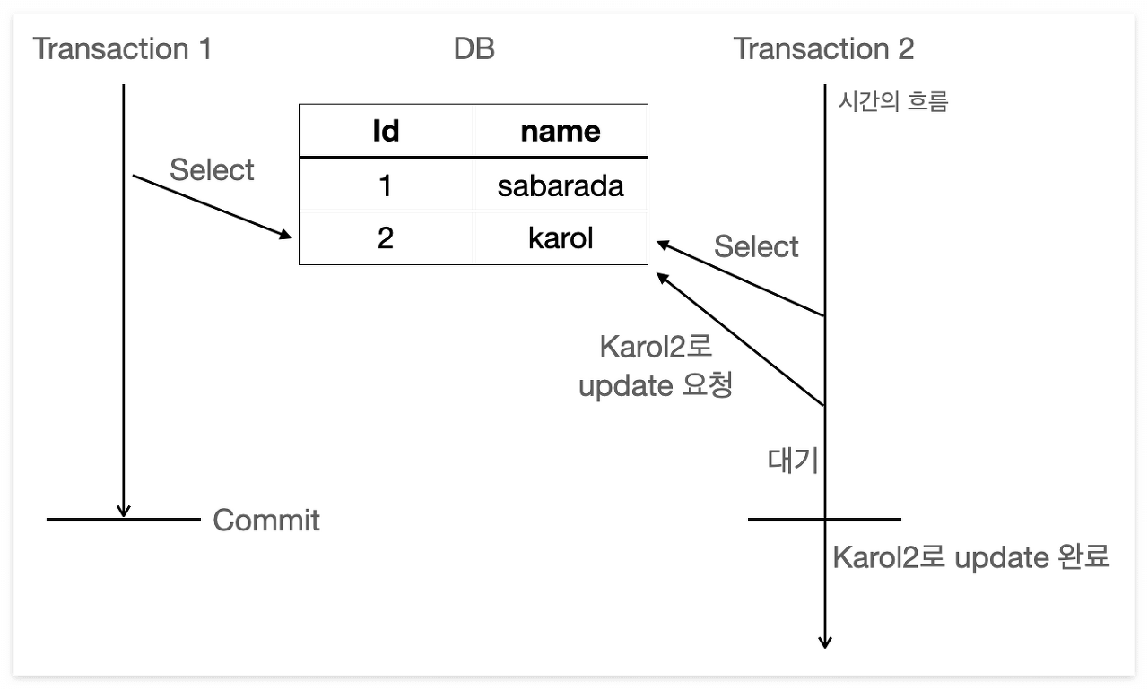 - Transaction_1 에서 table의 Id 2번을 읽음 ( name = Karol )