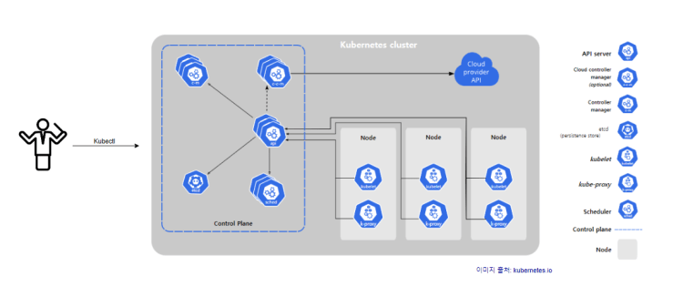 - 클러스터 : 컨트롤 플레인 및 하나 이상의 컴퓨팅 머신 또는 노드로 구성된다. 최소 하나 이상의 제어판 컴포넌트와, 이것과 연결된 몇 개의 워커노드로 구성되어 있다.