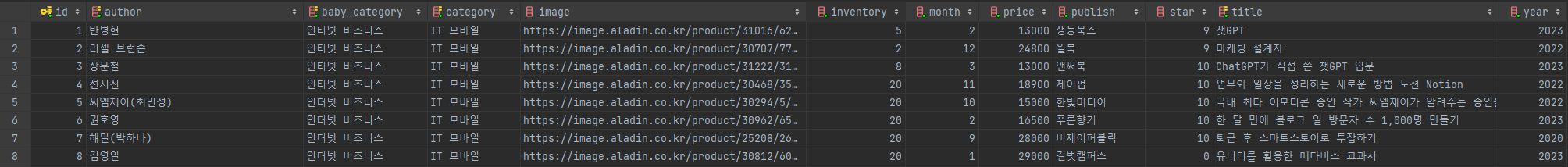 - id(PK), 재고량, 출발년, 출판월, 가격, 출판사, 별점, 제목, 작가, 소분류,대분류, 이미지