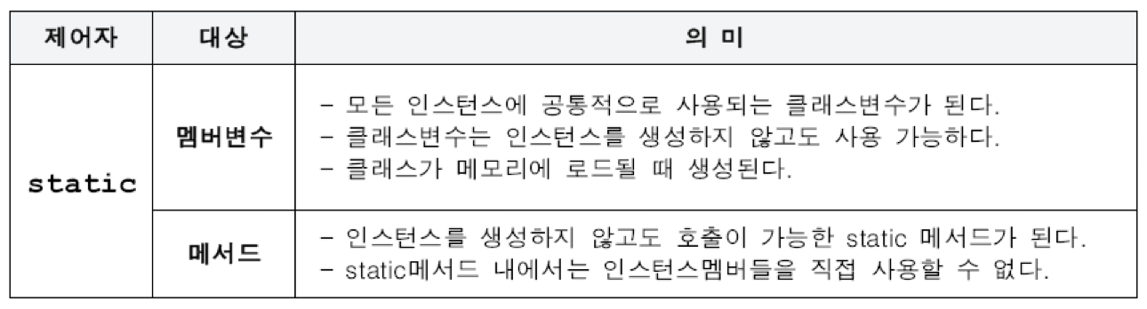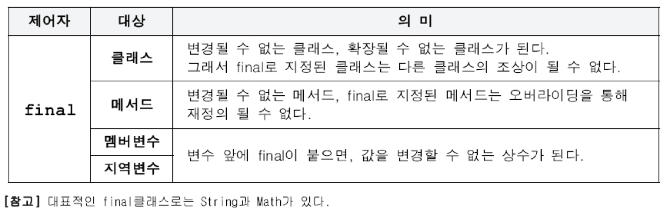 - 클래스와 멤버에 부가적인 의미 부여, 하나의 대상에 여러 제어자 사용 가능