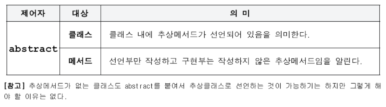 - abstract메서드의 접근 제어자가 private일 수 없음 : 자손 클래스에서 구현해야하기 때문